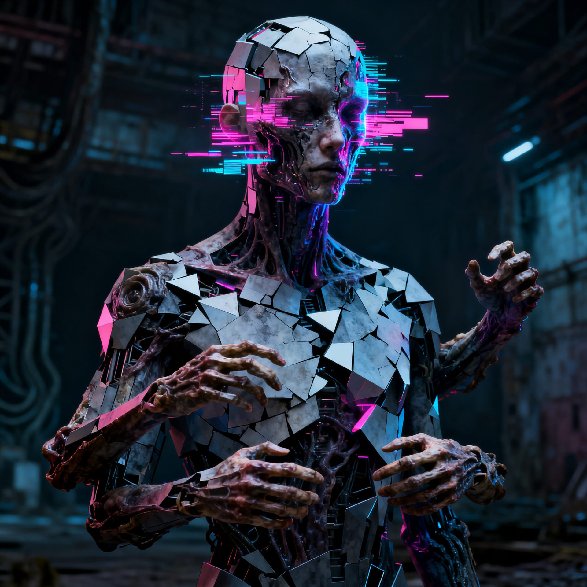 Prompt: "A haunting cyber-surrealist portrait of a humanoid figure, intentional AI anatomical errors, three extra distorted arms emerging from the torso, face melting into digital static, uncanny valley aesthetic, cinematic lighting, hyper-realistic textures clashing with broken geometry"
