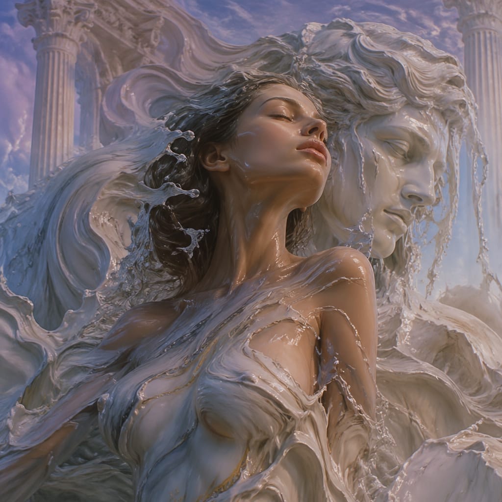 Prompt: "Dreamlike liquid aesthetic, a woman merging with a marble sculpture and flowing water, boundaries between skin and stone disappearing, psychedelic melting effect, soft pastel colors, ethereal atmosphere, AI hallucination style, fluid morphing"