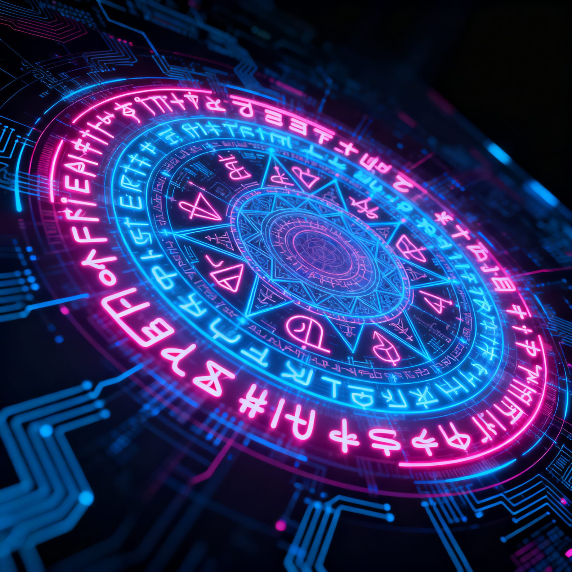 Prompt: "A futuristic holographic interface covered in complex asemic writing, meaningless alien characters, glowing neon typography that forms a circular mandala, intricate symbols that look like a mix of ancient runes and circuit board patterns, dark background, cinematic depth of field"